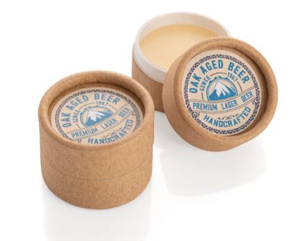 A mini vegan ecol lip balm jar made from FSC certified cardboard, contains no plastic and is compostable.