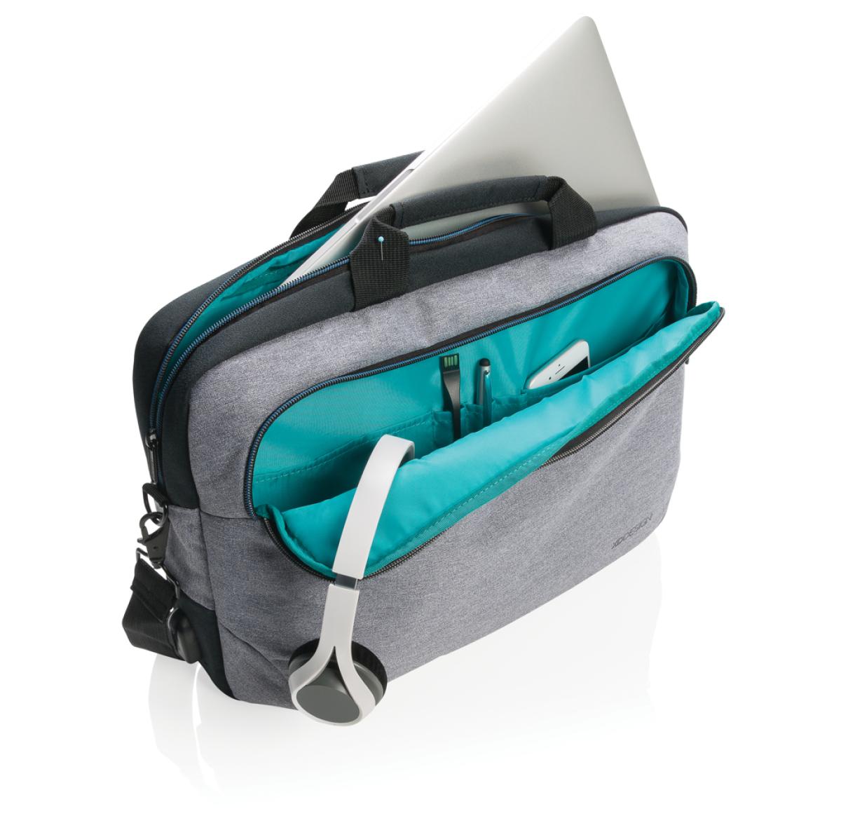 Unique designed 15” laptop bag with one large main compartment for your laptop and one front compartment. Connect your powerbank easily to the integrated USB charging port and charge your phone or tablet on the go. Registered design®