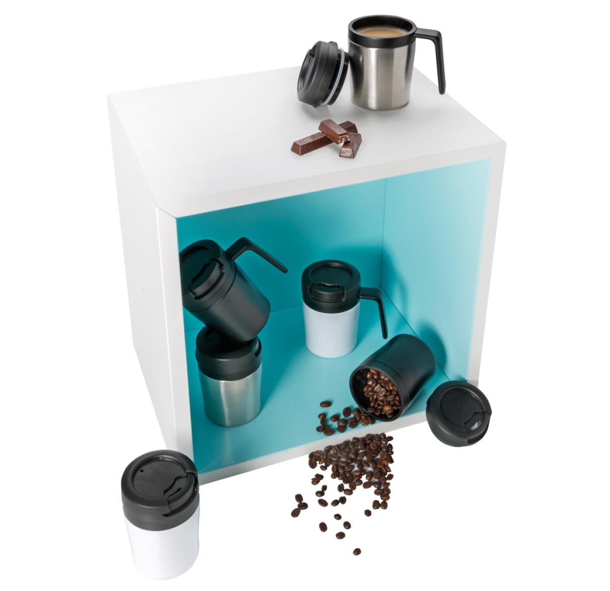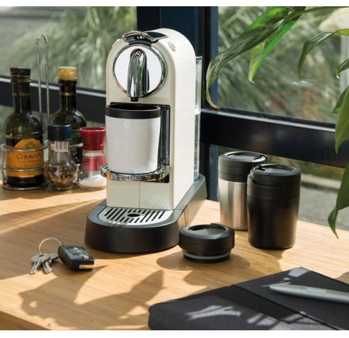 Less is more. Being 8cm high this is the perfect double wall mug for your coffee machine. PP inner. Easy twist spill proof lid. Great for Ristretto, Espresso and Lungo coffee. Hand washable only. Content 160ml. Registered design®