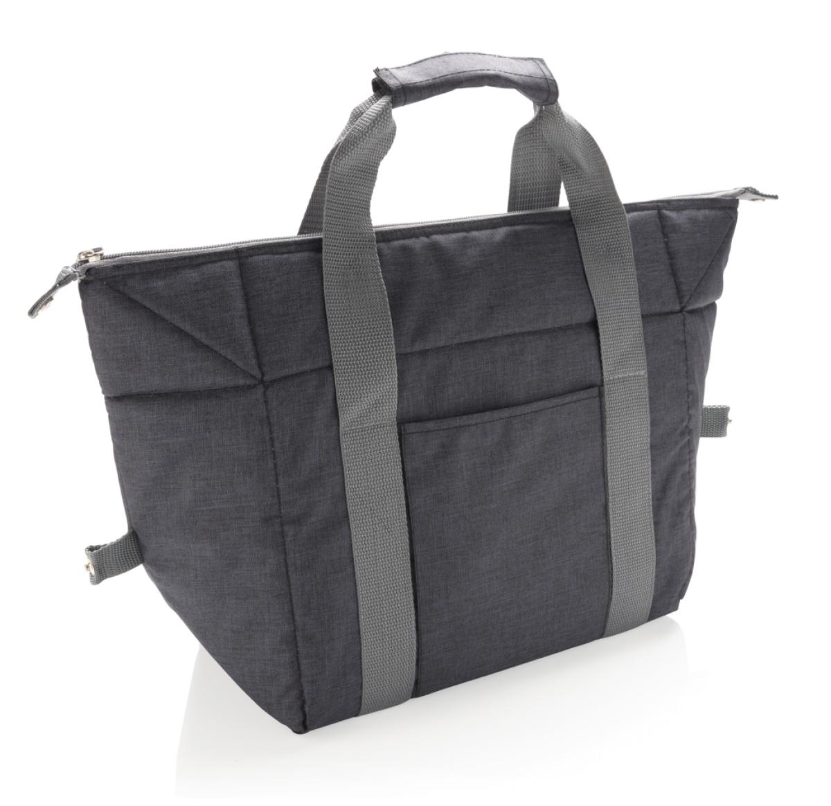 Medium size 600D tote cooler bag. Can hold up to 26 cans. Can be easily transformed to a duffle bag by closing the side buttons. With front sleeve pocket.