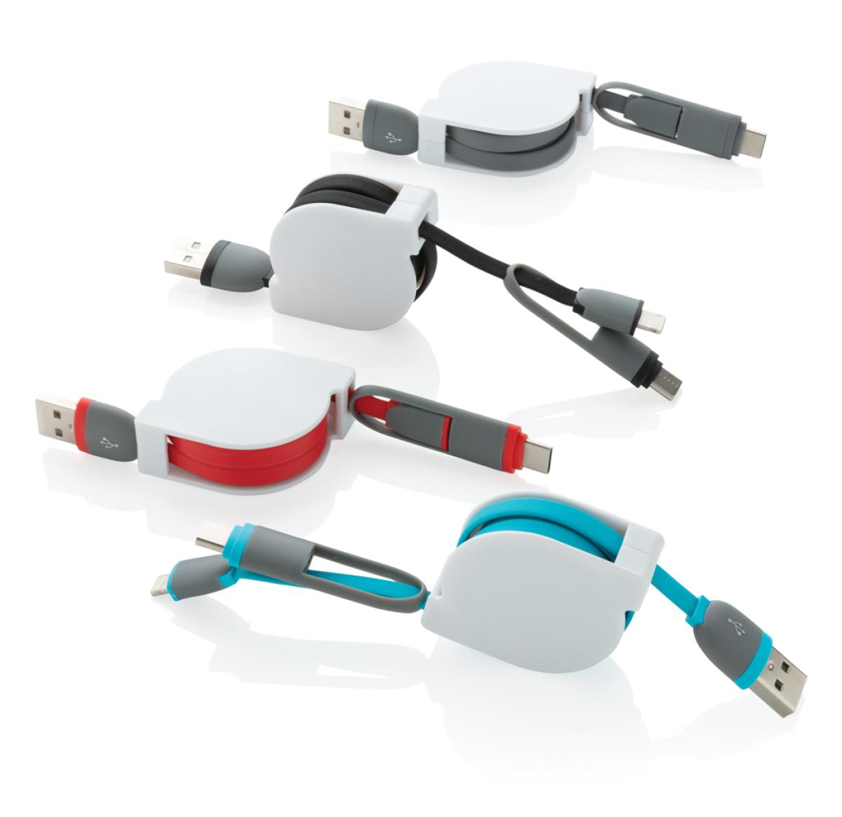 Compact and retractable 3 in 1 charging cable with type C and double-sided connector for IOS and Android devices that require micro usb. Because of the retractable mechanism the 100 cm long flat cable can easily be taken anywhere without it getting tangle
