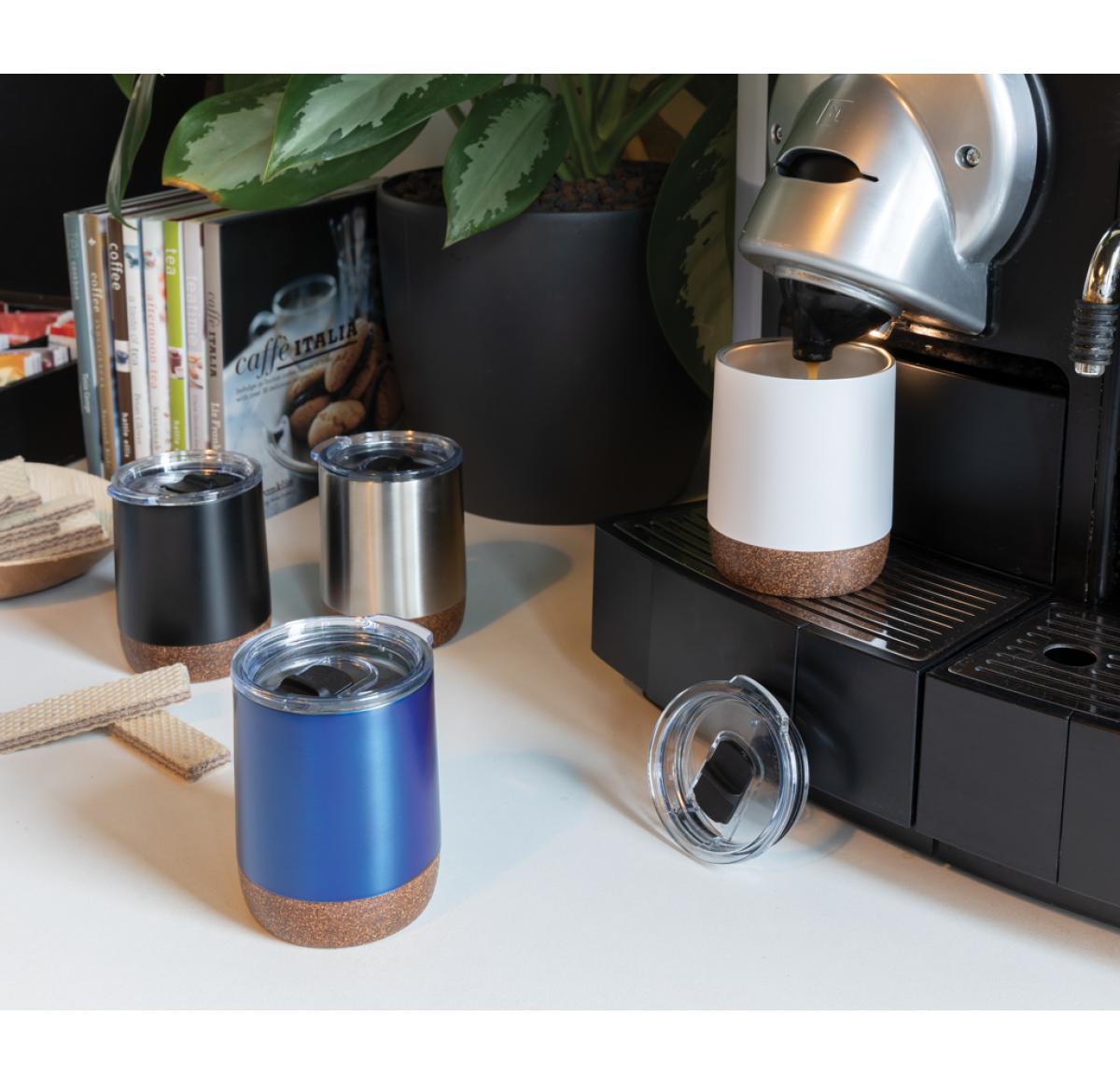 Vacuum insulated cork coffee mug with unique cork detail. 304 SS inside and 201SS outside. Keeps your drinks hot for up to 5h and cold up to 15h. Fits most coffee machines. Content: 180ml.