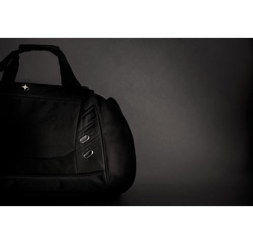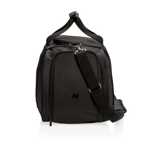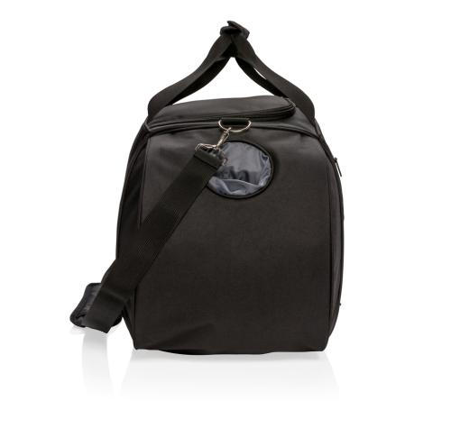 This 600D with 1680D polyester duffle bag offers sporty style for the gym or casual travel. Includes a roomy main compartment with a U-shaped top zipper closure, a side entry shoe compartment with air vent and a side bottle holder compartment. Front zippe