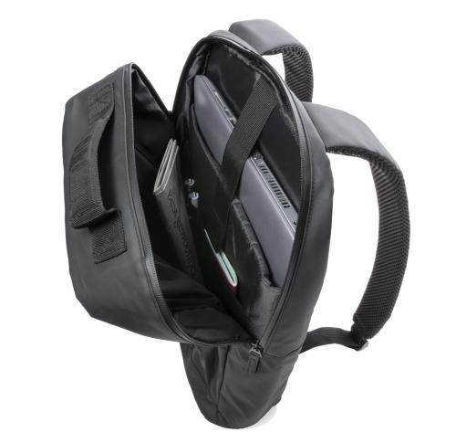 Look effortlessly stylish when carrying this all black laptop backpack. This bag holds a roomy compartment for all your gear and a laptop compartment that can hold a 15.6" laptop. PVC free.