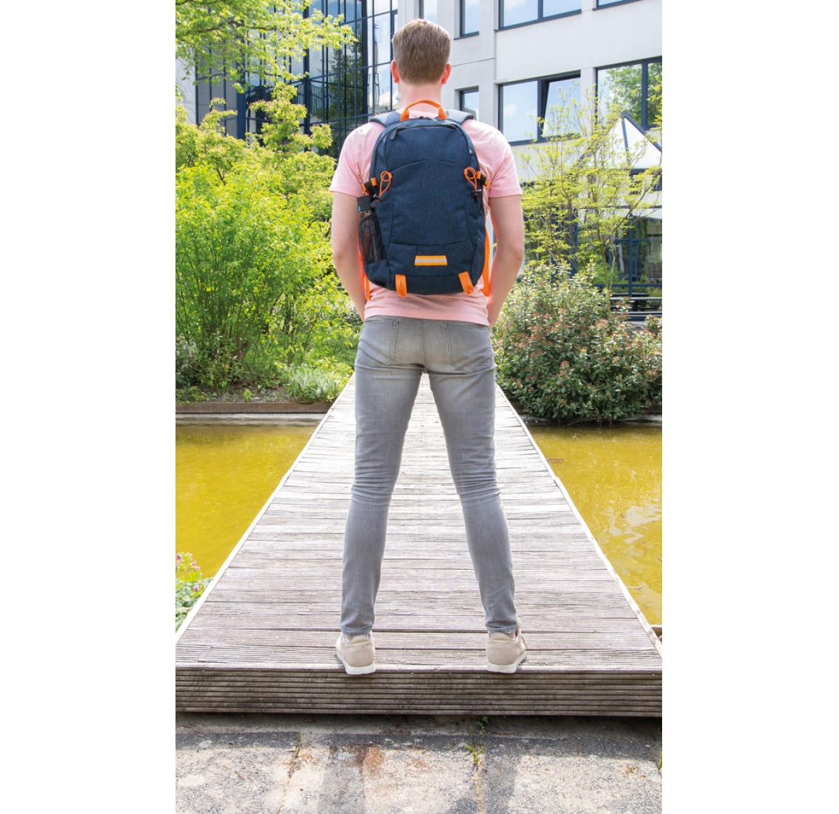 This large, versatile two-tone polyester backpack has a spacious main compartment for all your accessories. It is a fantastic pack for work, school or running errands. It will do a good job of protecting your laptop up to 15.6". Comes with reflective fron