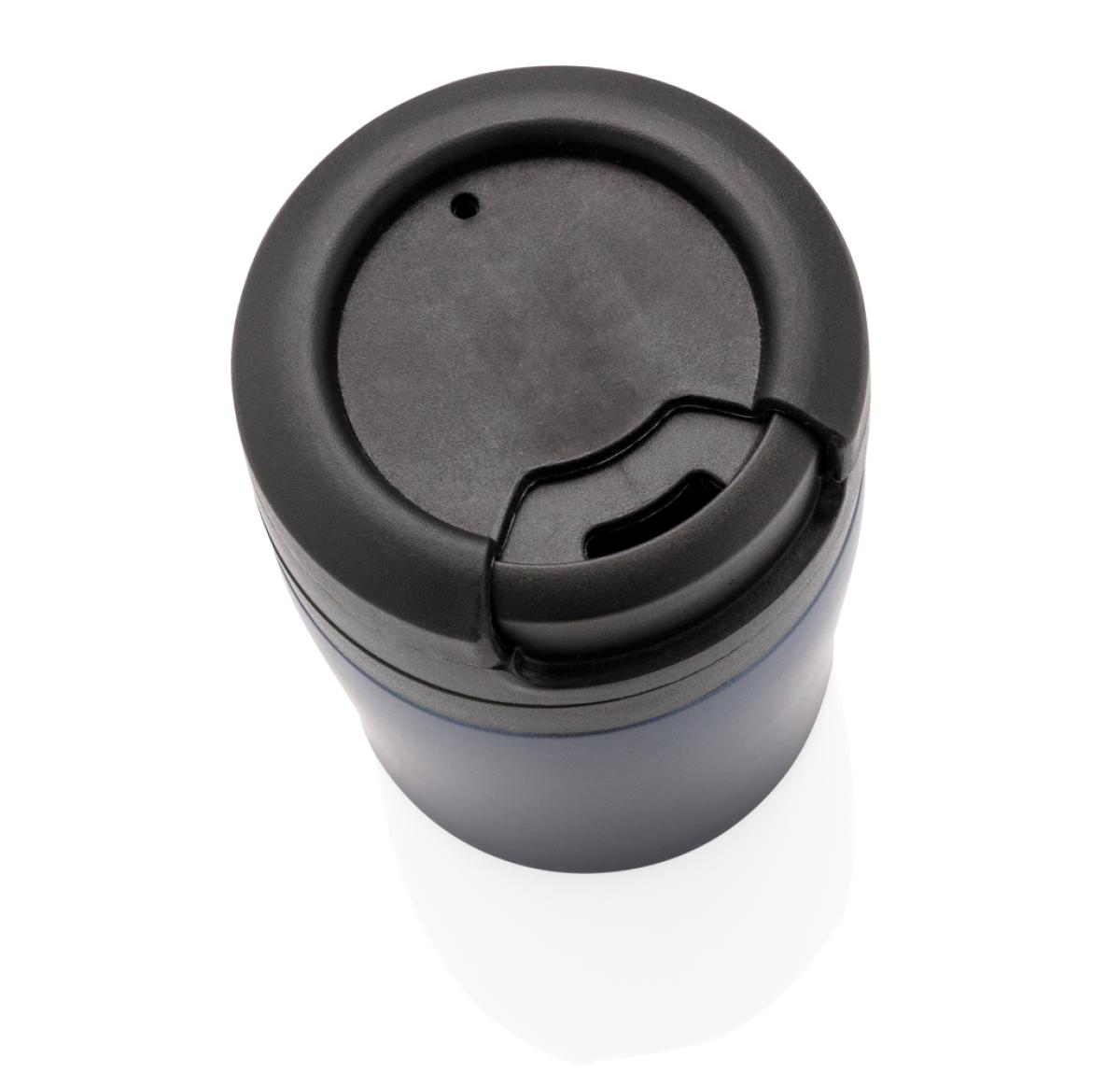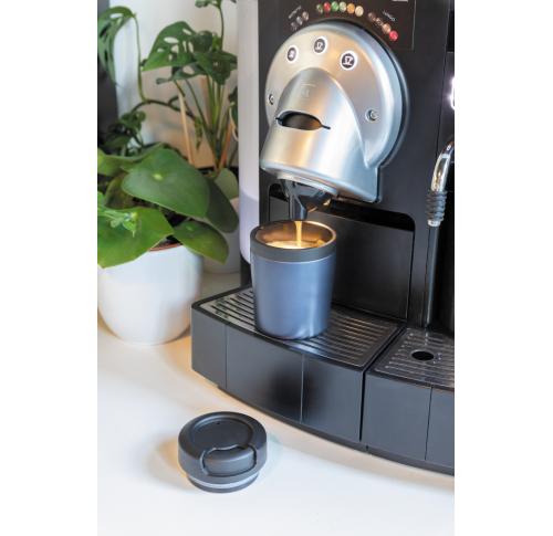 Less is more. Being 8cm high this is the perfect double wall mug for your coffee machine. PP inner. Easy twist spill proof lid. Great for Ristretto, Espresso and Lungo coffee. Hand washable only. Content 160ml. Registered design®