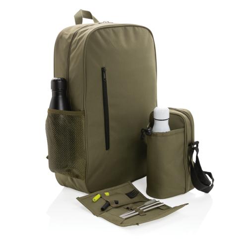 Keep your hands free and your stuff cold. The Tierra backpack is designed with maximum portability in mind. Great for hiking and picnics. The backpack holds 12 cans or 8 cans and 2 wine bottles. A zippered front pockets holds your keys and other accessori