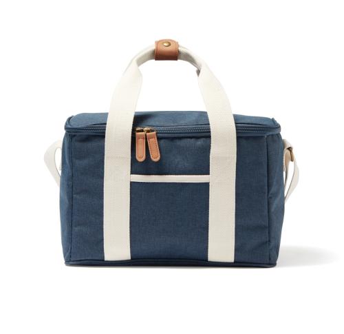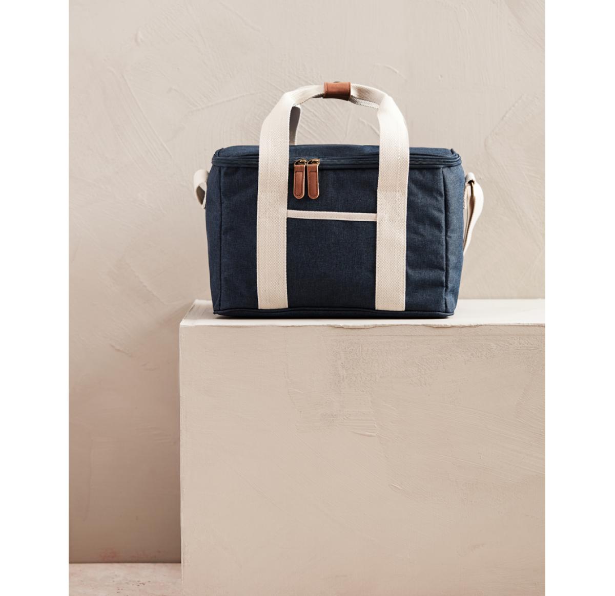 The ultimate cooler basket, mottled tone by tone with details in imitation leather and cotton. Made from 50% recycled material from PET bottles. There is also a small compartment on the outside of the cooler bag, providing space for other items as well. The thick PEVA padding ensures that the cold is retained for a long time. It is also easy to clean and dry after use. Thanks to the adjustable shoulder strap and the double handle, you have several ways to carry the cooler basket.