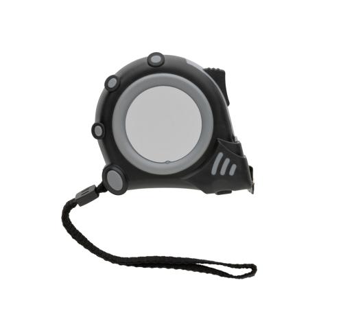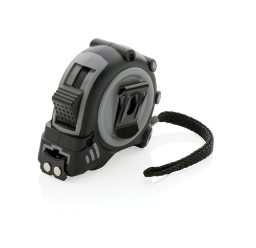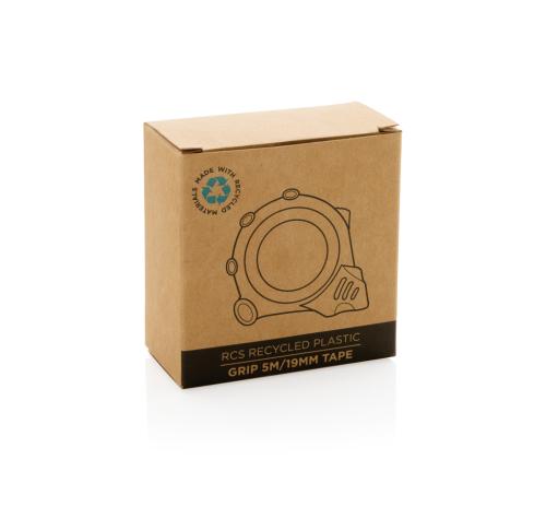 5 metre tape made with RCS (Recycled Claim Standard) certified recycled ABS. Total recycled content: 15% based on total item weight. RCS certification ensures a completely certified supply chain of the recycled materials. With deluxe TRP rubber grip for extra control. With release/hold button. With 19mm single sided tape, yellow with black carbon steel hook with two integrated magnets. With polyester wrist strap. Packed in FSC?? mix kraft packaging
