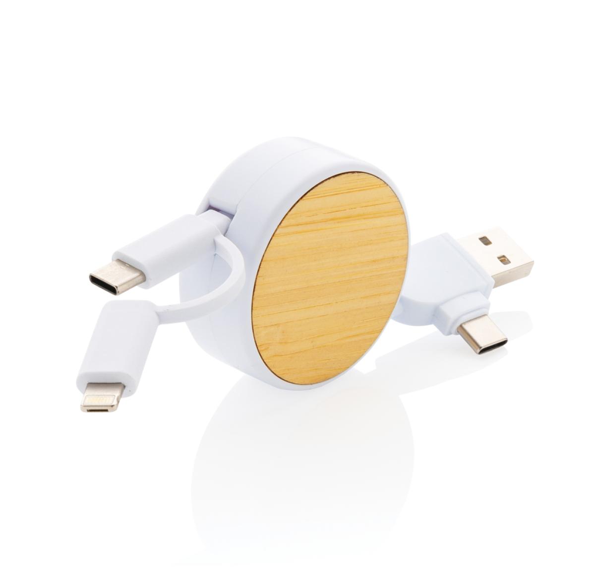 Compact and easy to carry retractable multi cable made with certified recycled materials. Comes with 5 different connectors: USB C in, USB A in, type C out, IOS out and micro USB out. This also allows you to use the cable with type C output devices that are included in the newer generation of phones and macbook computers. The cable also has a USB A output input option so it can charge any device from any output source. Casing made from FSC bamboo and RCS certified recycled ABS, cables made from RCS certified recycled TPE material. Total recycled content: 63% based on total item weight. Max cable length: 100 cm. Packed in FSC mixed kraft sleeve packaging. RCS certification ensures a complete certified supply chain of the recycled material. PVC free.