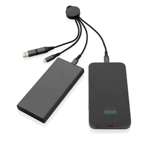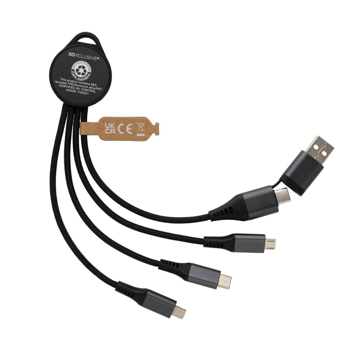 Charging cable made with RCS (Recycled Claim Standard) certified recycled aluminum, recycled TPE and recycled pet. Total recycled content: 68% based on total item weight. RCS certification ensures a completely certified supply chain of the recycled materials. Aluminum does not lose its characteristics in the recycling process and can be recycled endlessly. With dual input connector: USB A and type-C. Triple output: Apple Lightning/Micro and Type C, offering in total 6 charging options. With RCS certified braided recycled PET cables with a length of 12 cm. Packed in FSC?? mix packaging. Suitable for charging, syncing, and compatible with car play. Supports fast charging up to 9V/2A.