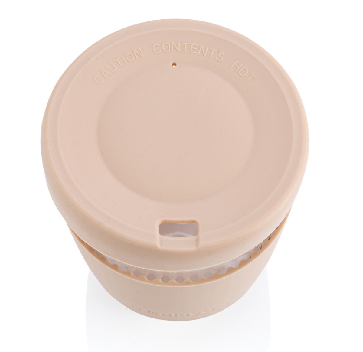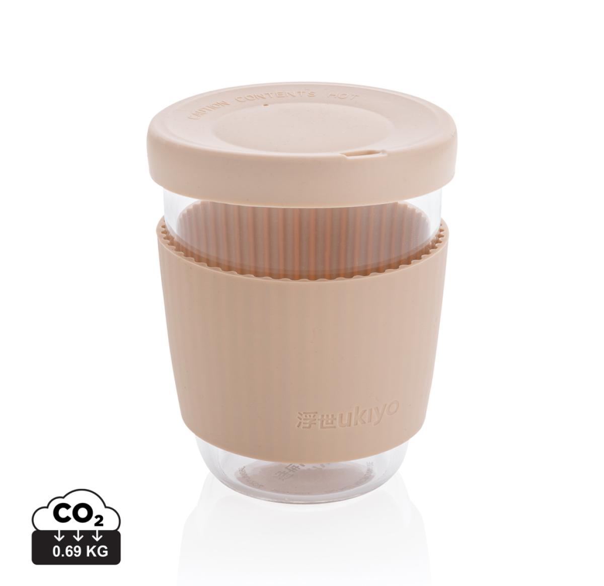 Enjoy your coffee at work or at home in this Ukiyo borosilicate glass with silicone lid and sleeve. The cup has a nice grip and a slim shape. A small vent in the lid allows steam to escape to prevent pressure build-up. BPA free. Capacity 360ml.