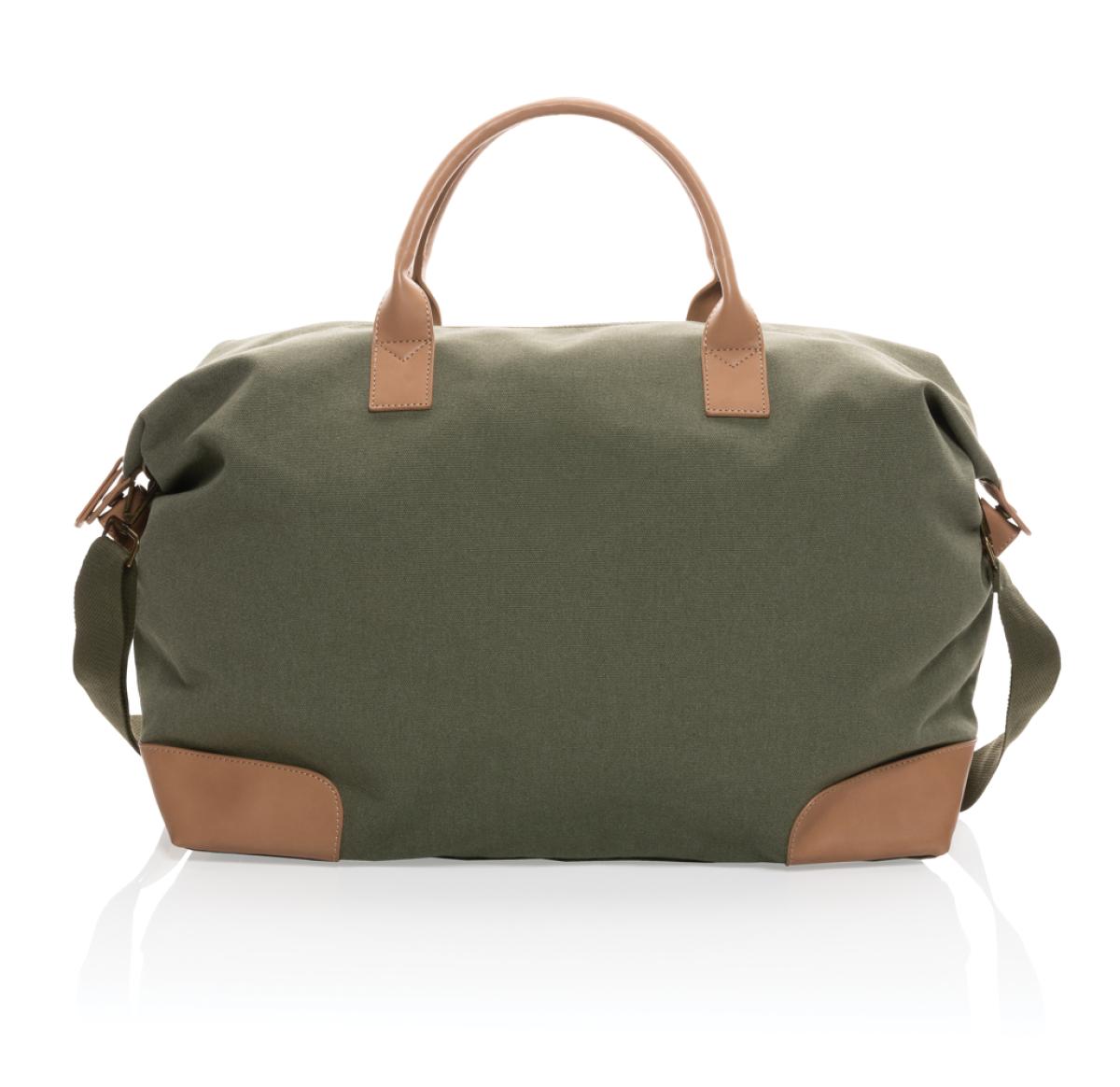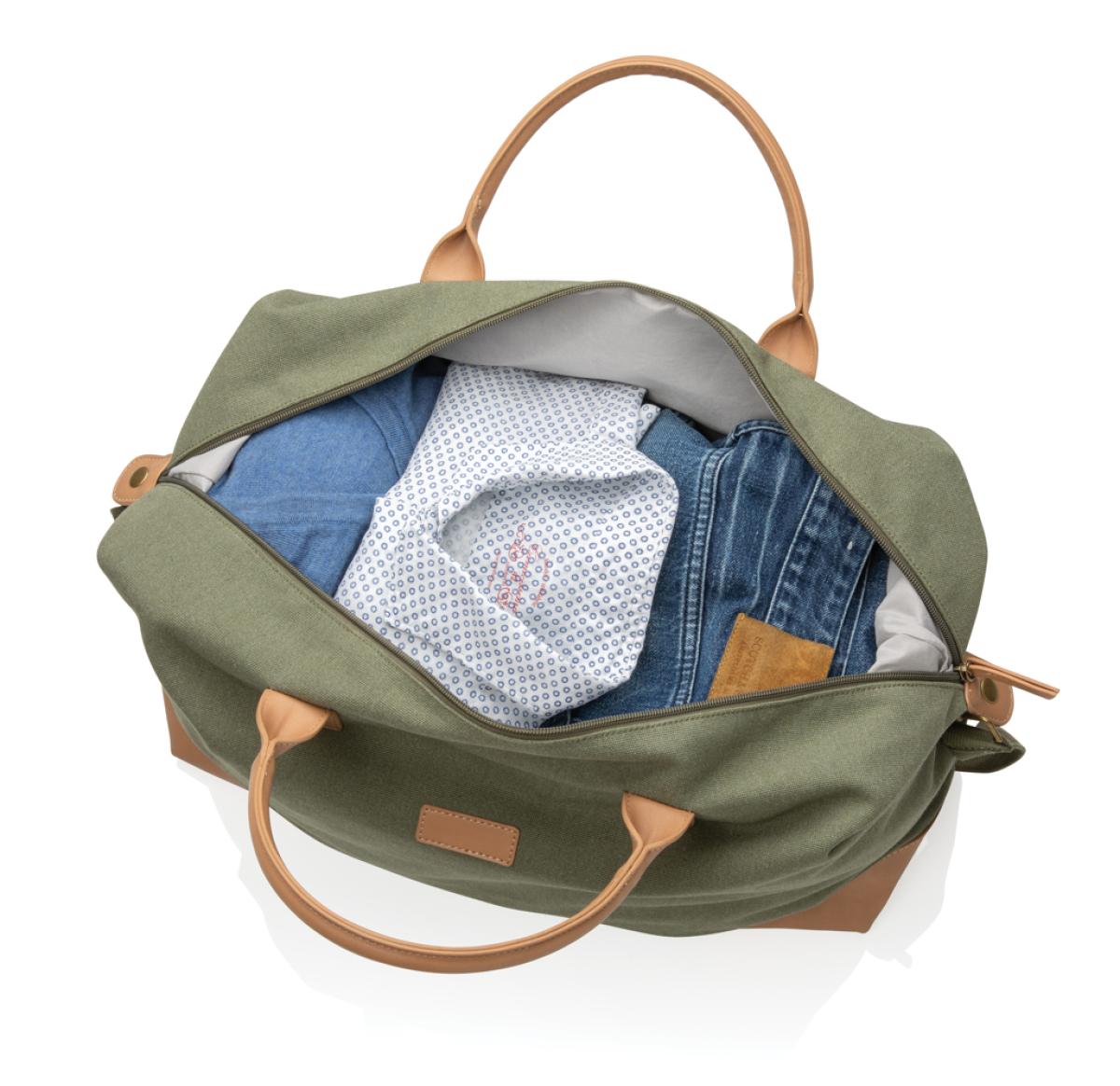 Plan your perfect getaway with this large 16oz. recycled canvas weekend bag. The bag features one big roomy compartment with front pocket and PU handles. The bottom features four brass studs to keep your bag clean when placed on the floor. Each weekend bag saves 1970 litres of water. 2% of proceeds of each Impact product sold will be donated to Water.org. Composition 60% recycled cotton and 40% recycled polyester. Lining in 150D recycled polyester.