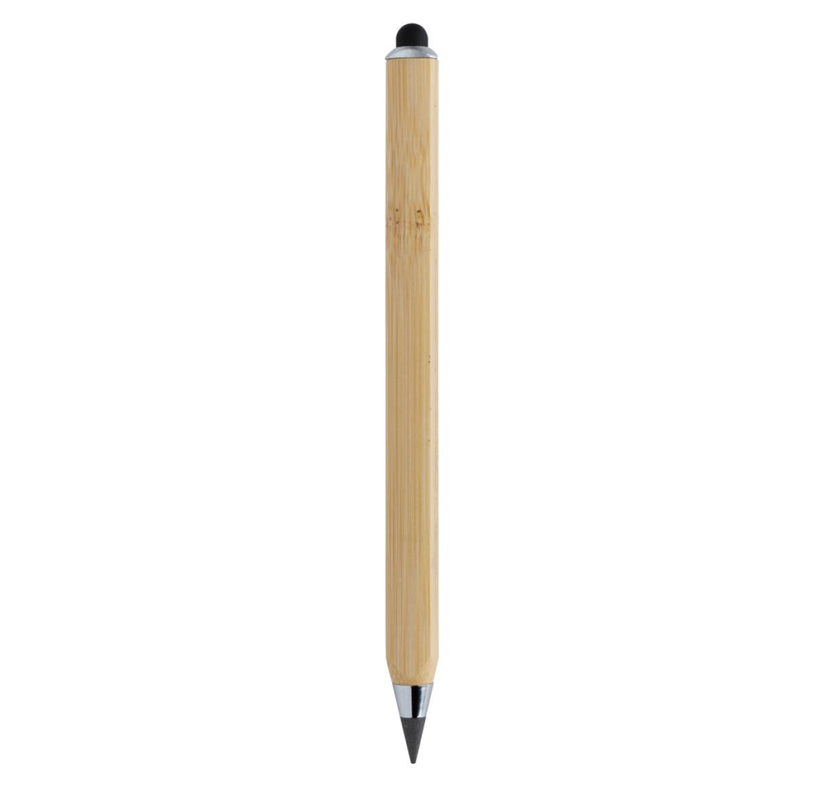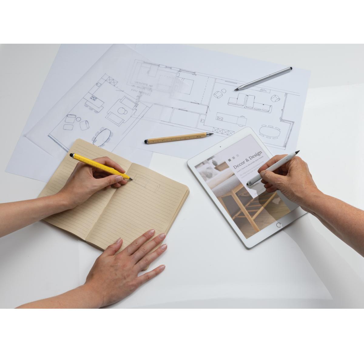 Modern infinity pen made with FSC® 100% certified bamboo. Triangle shaped body, one side with CM indication and one side with Inches. Traditional wooden pencils write only up to around 200 metre but this Tree free infinity pencil, has a writing length of up to around 20000 metres using a graphite tip to produce a graphite line. Not only does it write like a pencil, but the markings can be erased. It works by leaving a graphite line on paper just like a regular traditional wooden pencil but it wears down so slowly, that it should outlast up to 100 traditional wooden pencils! With touch tip to operate mobile device. Packed in FSC® mix packaging.