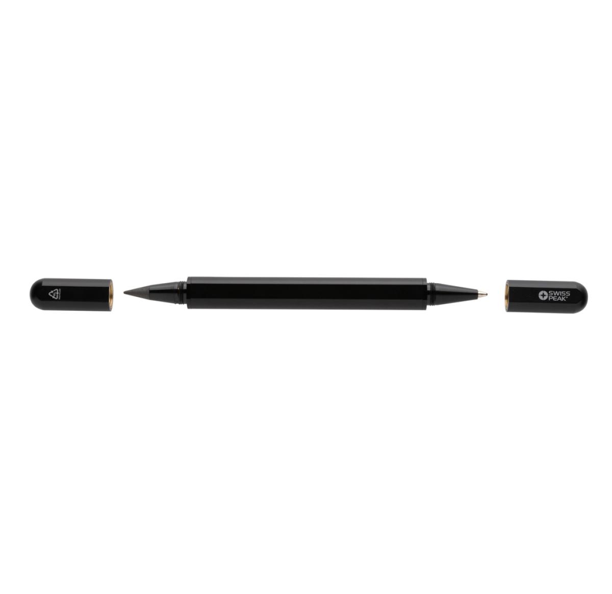 Experience superior writing with this exceptional pen made from RCS certified recycled aluminum. It combines style and low impact with 83% recycled RCS recycled certified aluminum content. The pen boasts two tips – a graphite tip on one side and a ballpen on the other side, ensuring smooth and precise writing with blue ink. Writing width 1mm, writing length 1200 metres. Its unique design breathes sophistication. Packaged in an FSC® mix black Swiss Peak gift box. Total recycled content based on item weight: 83%