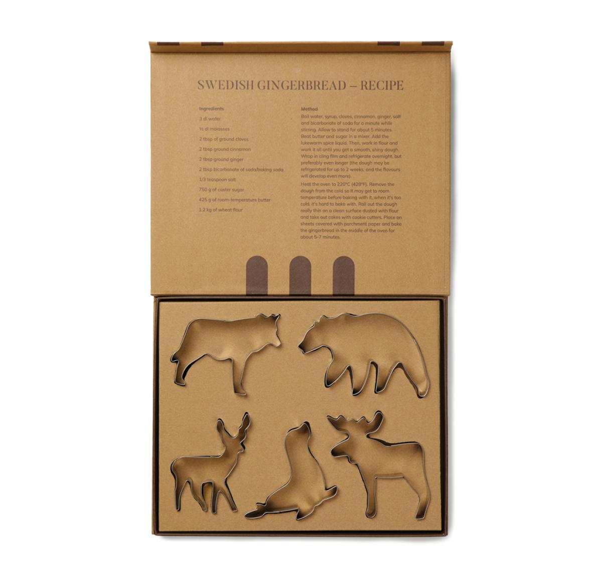 Bake your way into the Nordic wilderness with our 5 piece cookie cutter set made from premium stainless steel. Each cutter features a different animal shape found in Scandinavia. Durable and easy-to-clean cutters with sharp edges for precise cuts. Packaged in a stylish gift box, the inside lid of the box features a Swedish ginger cookie recipe, adding an authentic Scandinavian touch to your baking adventures.