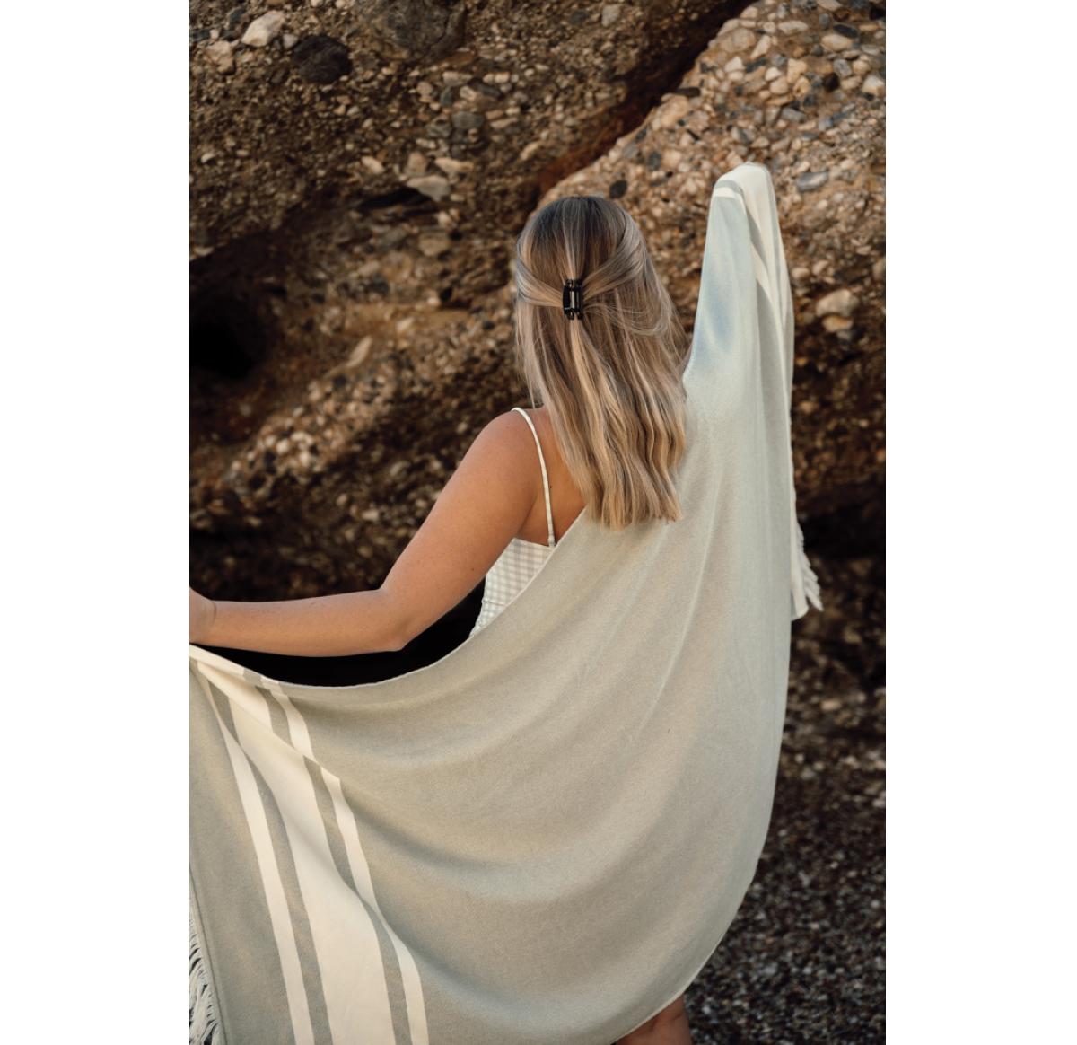 Hammam towel designed with two different types of texture, one side in terry and the other side in plain weave. The two-sided design makes this towel the ultimate companion when you're at the beach, by the pool, or when on an adventure outdoors. It has an excellent absorbency and dries up quickly. The towel is crafted from 75% cotton and 25% polyester and has a thickness of 360 gsm. Measurements: 180x80cm, fringes in 5cm excluded. OEKO-TEX® STANDARD 100. 09.HIN.68091. Hohenstein HTTI.
