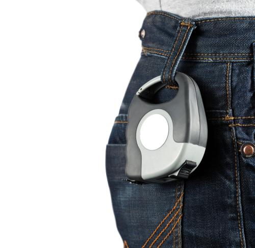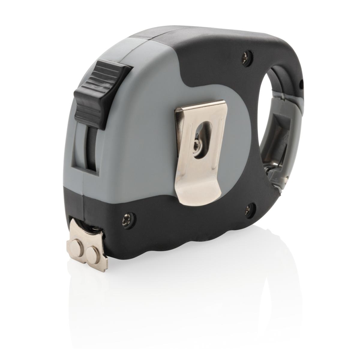 5M/19mm measuring tape, with carabiner, grey ABS case with black TPR grip, black belt clip, black self-lock button, black end hook with 2 strong magnets, yellow tape, matt silver PVC sticker. Registered design®