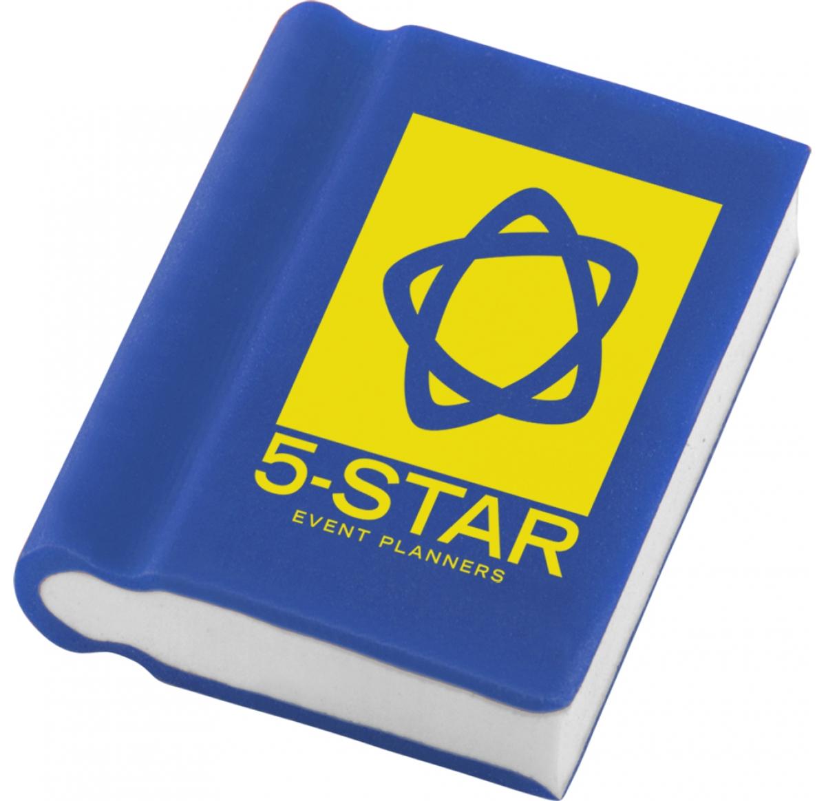 A novelty eraser in the shape of a book. Can be printed in up to four spot colours. Print available on both sides of the eraser at extra cost.Overall size 40mm x 30mm x 10mm