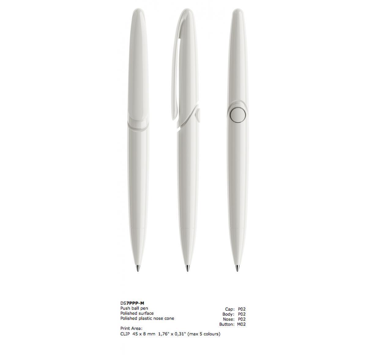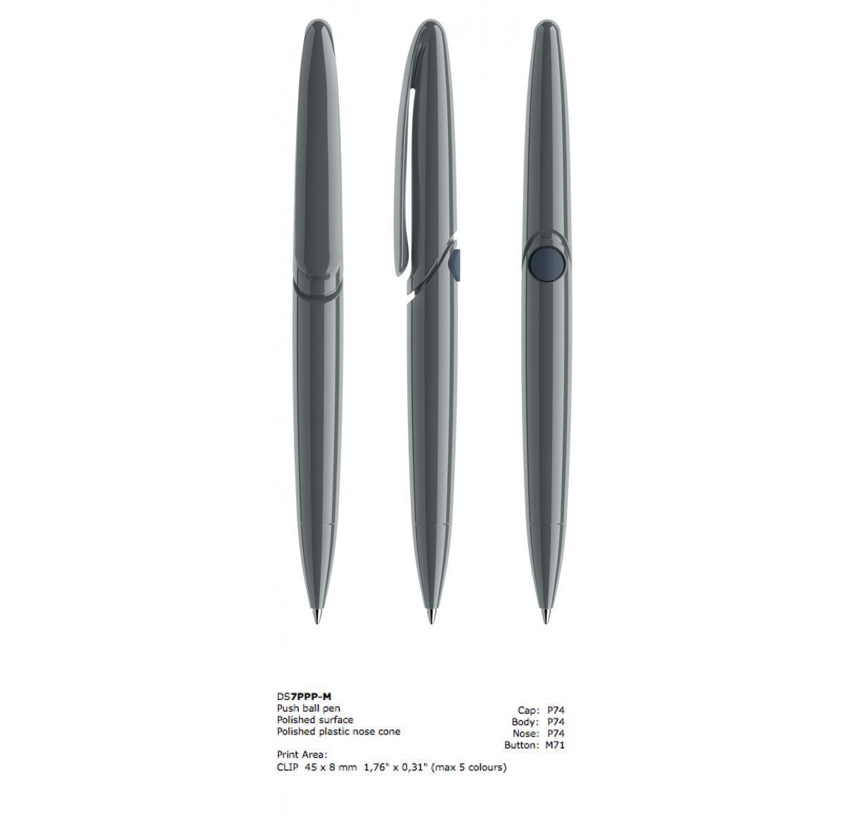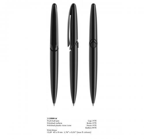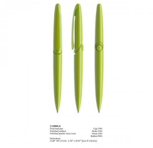 The DS7 push mechanism ballpen has a bold design, large print area and an innovative mechanism. Available in 6 finished and up to 21 colours. Metal nose cone available as an optional extra.