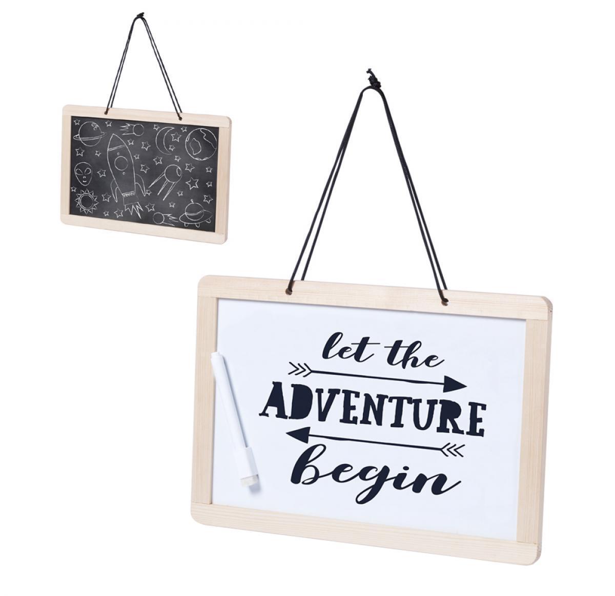 Reusable white and black board with one side dry wipe and the other chalkboard. This framed memo board is supplied on a string for hanging. Included are a felt tip pen, eraser and three chalks. Ideal for keeping reminders.