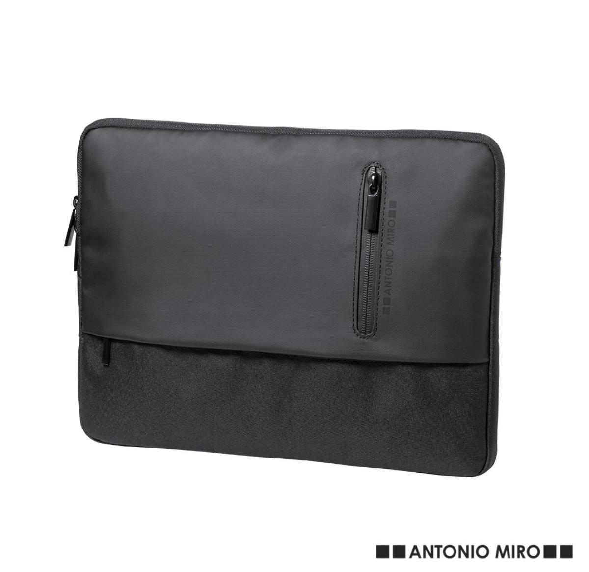 Antonio Miró computer sleeve in premium quality, made of durable 600D polyester. With a sober design and padded laptop compartment for laptops up to 15 inches. Zip closure with metal pullers and front pocket. Brand logo at front.