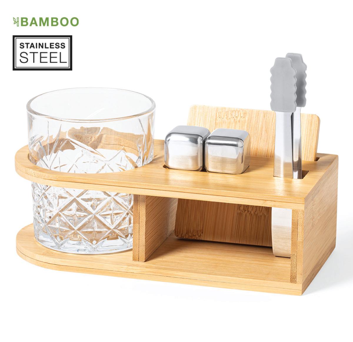 High quality whisky set with elegant bamboo stand. Including glass in an attractive design and 350 ml capacity, 2 reusable ice cubes in stainless steel, with matching tongs and bamboo coaster. Presented in an individual eco-design box in kraft cardboard.