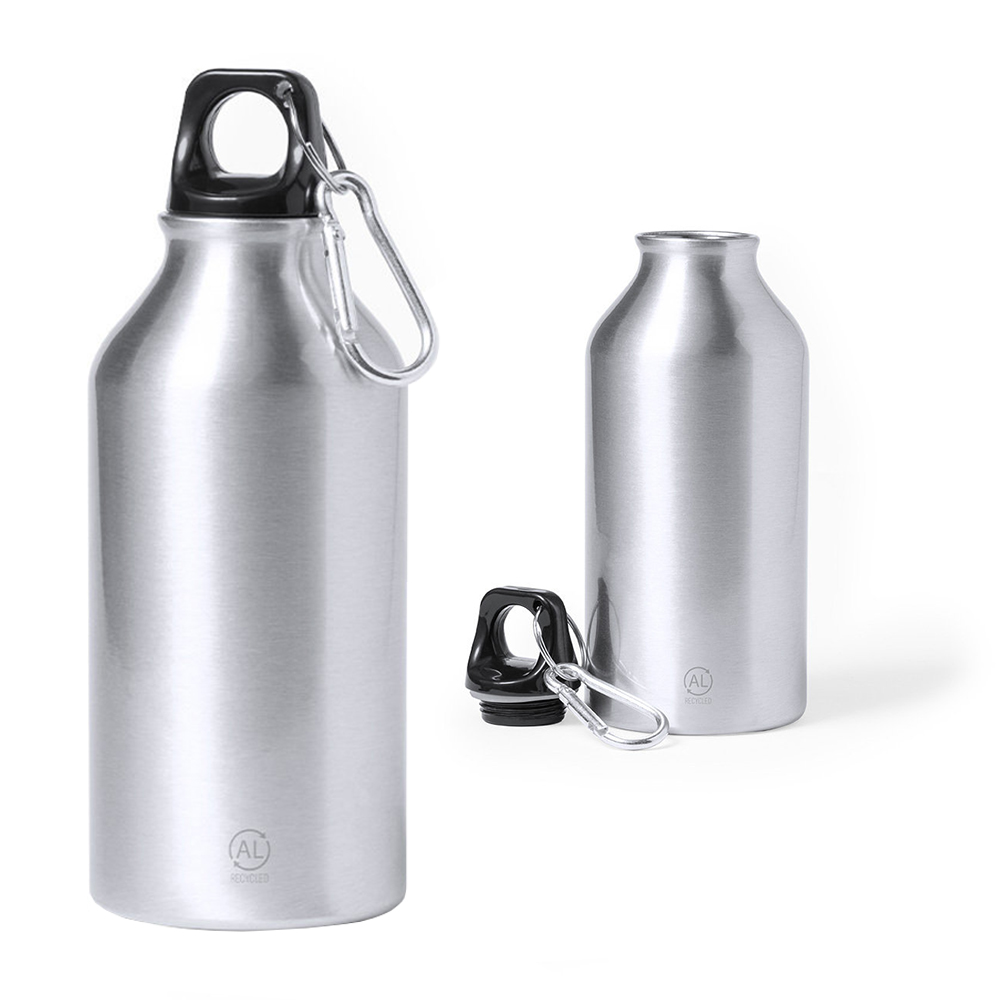 400 ml capacity bottle. Made of recycled aluminium, a material with almost infinite recycling possibilities, keeping its original properties and consuming less energy in this process. Matte finish, with black screw cap, ring and carrying carabiner. BPA free and presented in an individual box with kraft design.