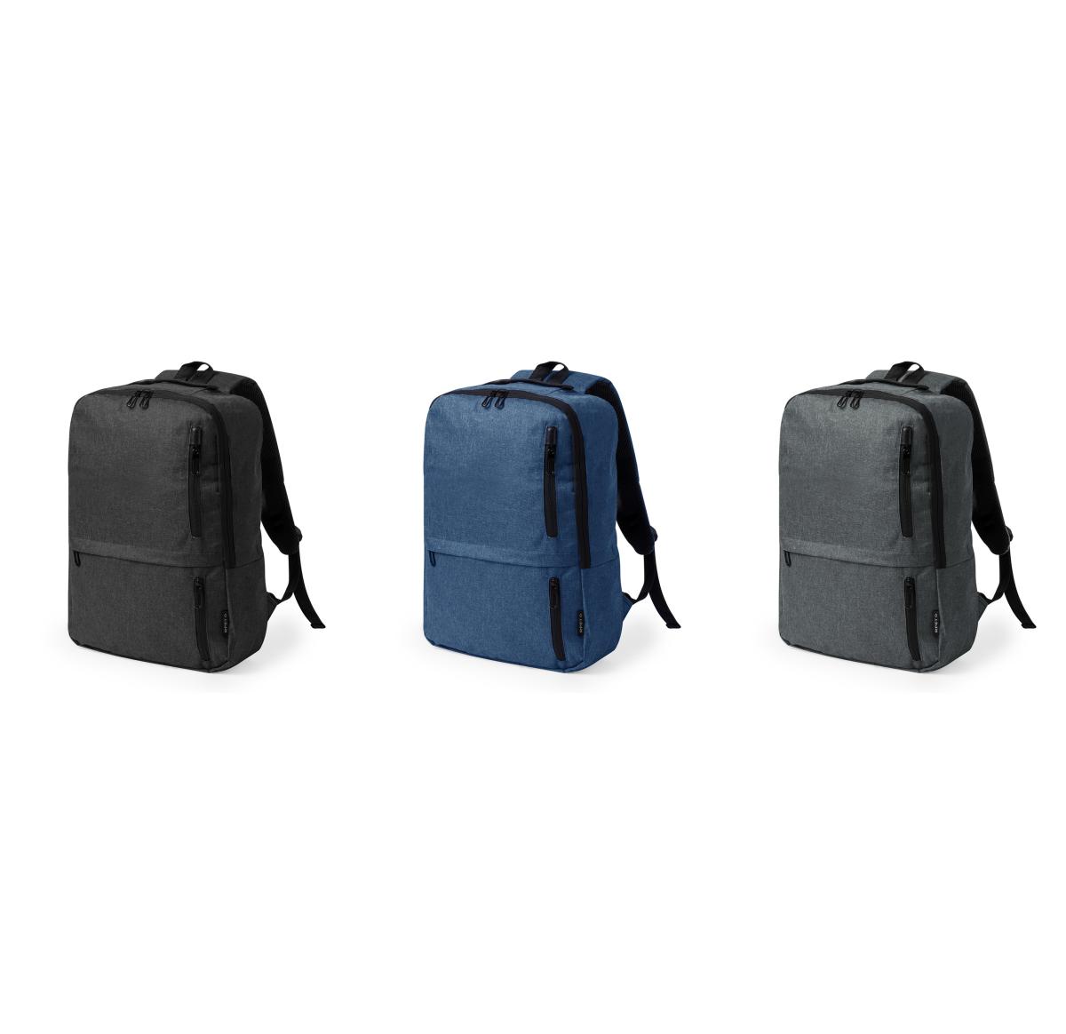 Backpack made of durable 600D RPET. Equipped with a double-pull zip closure and three quick-access front pockets. Inside, it features padded compartments designed to fit up to a 10 inch tablet and 15 inch laptop. The shoulder straps are padded and adjustable for comfort. It also features a top strap and side pocket for added functionality. Available in three stylish colours, with black zips. RPET badge on label. Presented in an individual Recycled bag.