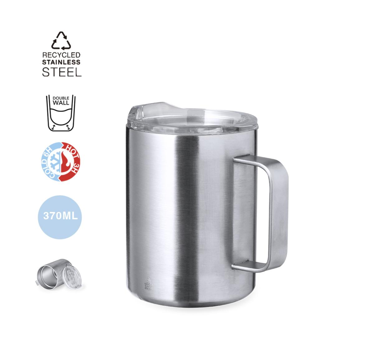 Recycled Stainless Steel thermal mug with double wall and 370 ml capacity. With dispenser in lid, BPA free, and in silver finish.With Recycled Stainless Steel logo and presented in an individual kraft design box.