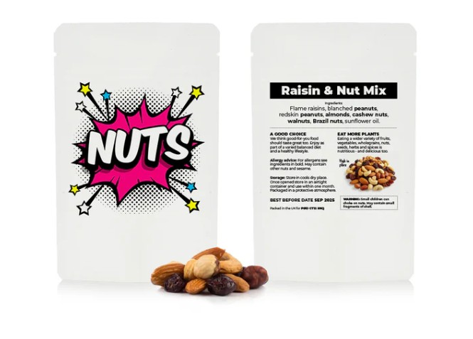 Branded healthy fruit and nut printed powch, available in range of colours and sizes - full colour digita print to both sides
