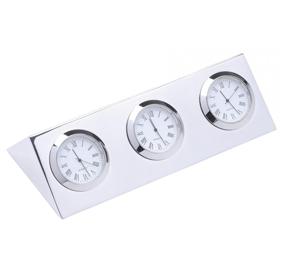 Promotional Exectuive Three City Desk Clock Set In Palladium Nickel Plated Finish. Triangular Triple Design Showing Three Independent Clock Faces. Gift Box.