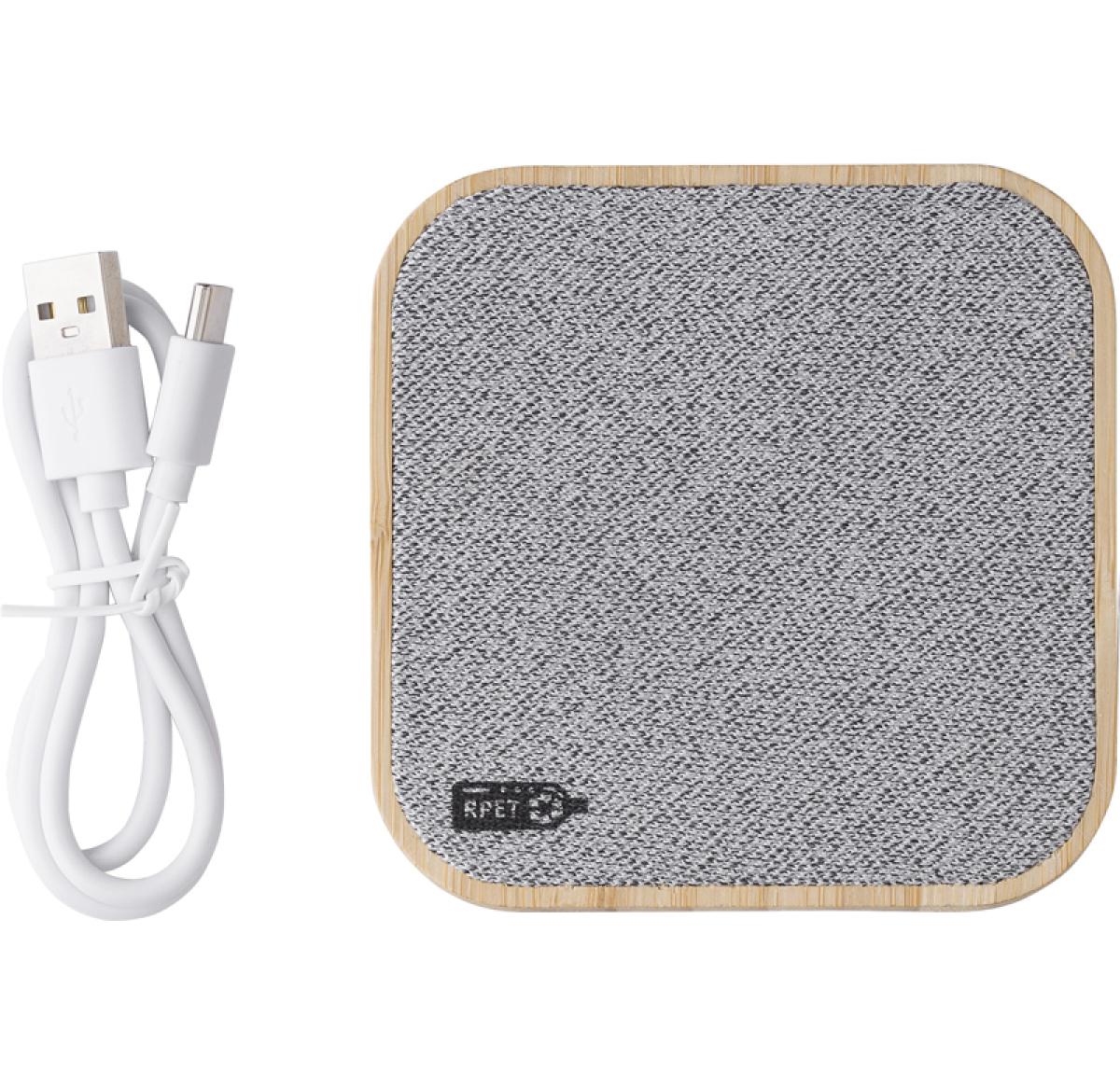 Fast charging 15W bamboo wireless charger with RPET polyester trim. Individually packaged in a brown cardboard box.