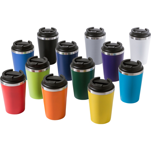 Stainless steel travel mug (350 ml). The lid has a silicone closing ring with a foldable closure on top. Individually packaged in a brown cardboard box. The inside is double walled plastic.