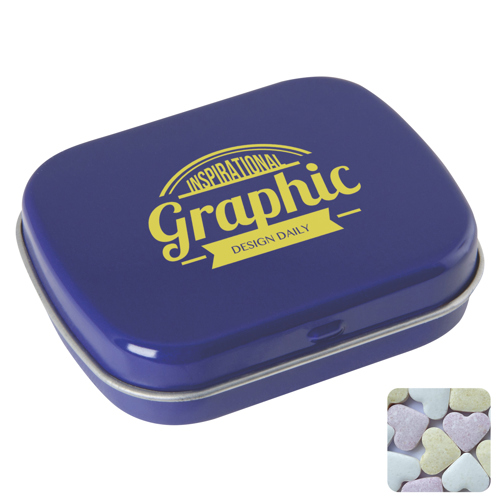 Flat hinged tin with fruit heart sweets. Dextrose hearts with natural flavours and dyes.