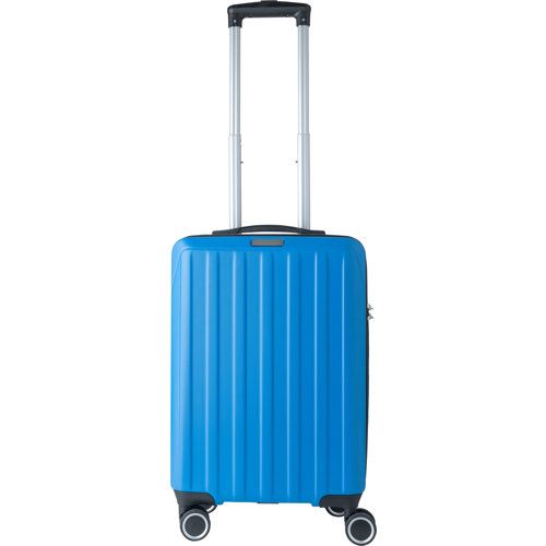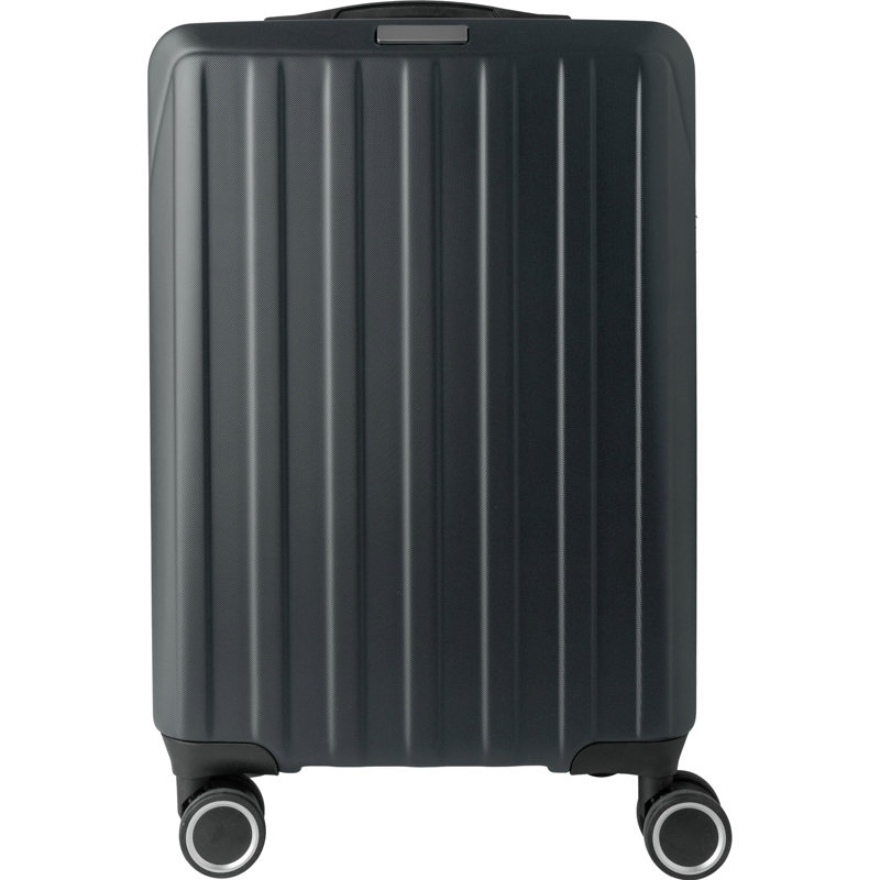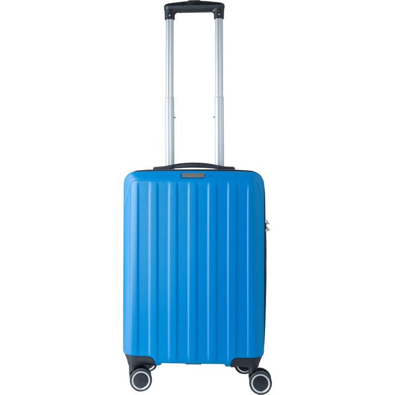 Hard-shell trolley with eight dual spinner wheels, a three-level telescopic handle, combination lock (non-TSA) and three interior compartments. Capacity: 30L. Individually packaged in a brown cardboard box.