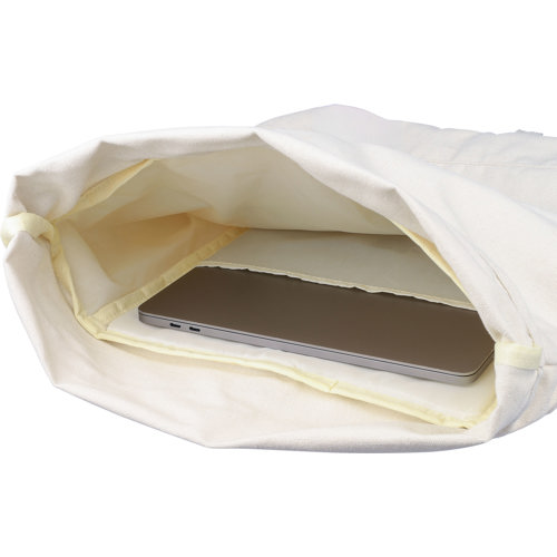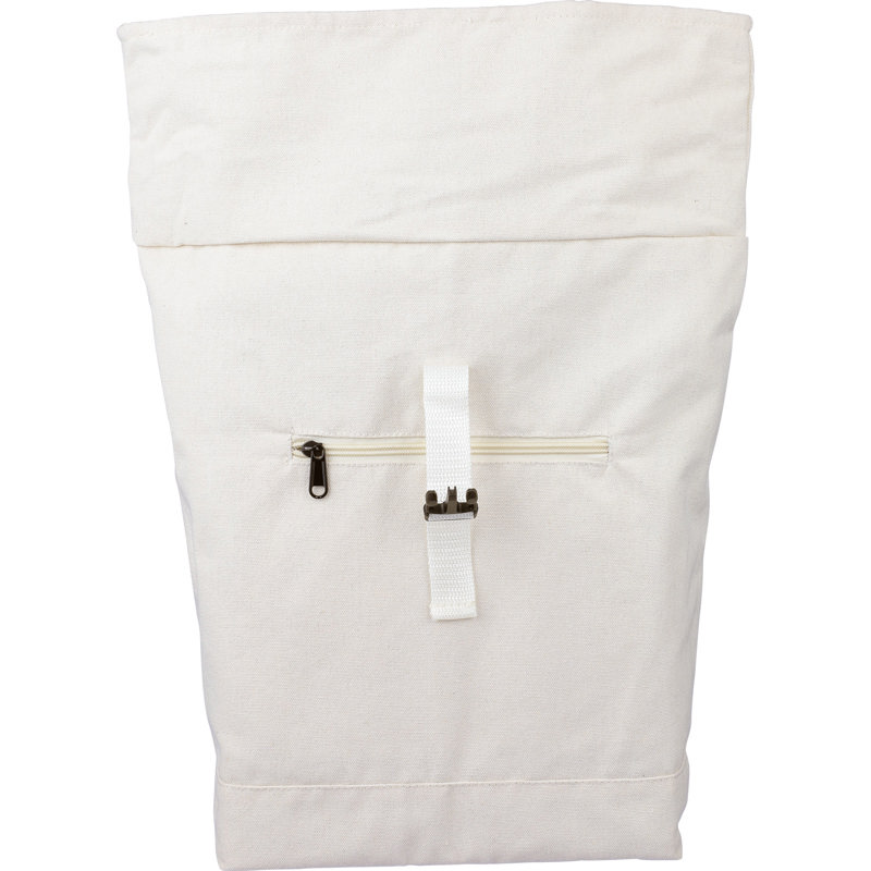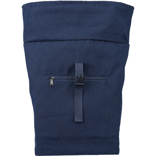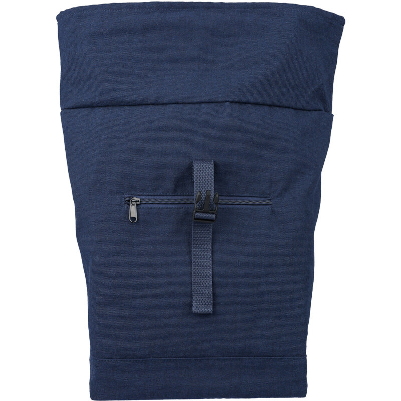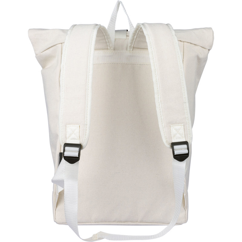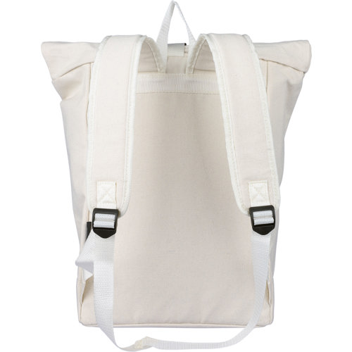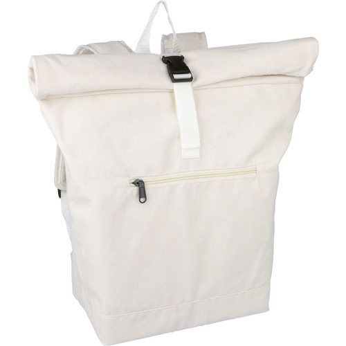 Recycled polycotton roll-top backpack with a 210D polyester lining and a plastic buckle closure. The bag has a 15L capacity, and a large zipped compartment with a pocket for a 15-inch laptop The design includes a top carrying loop and padded adjustable shoulder straps.