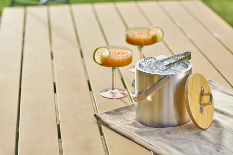 Double-walled 1200ml stainless steel ice bucket with a bamboo lid,ice tongs and a stainless steel carrying handle. Individually packaged in a brown cardboard box.