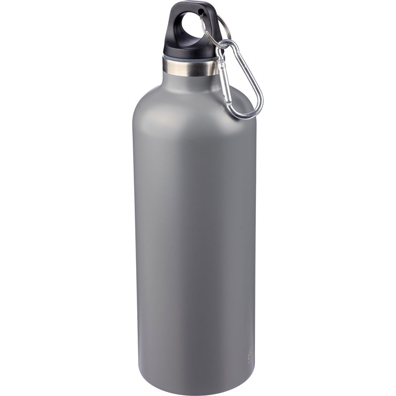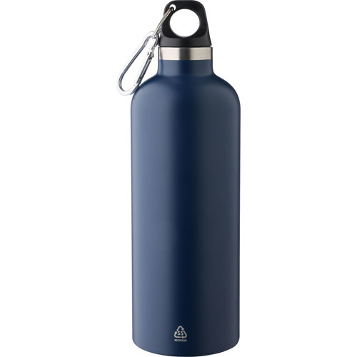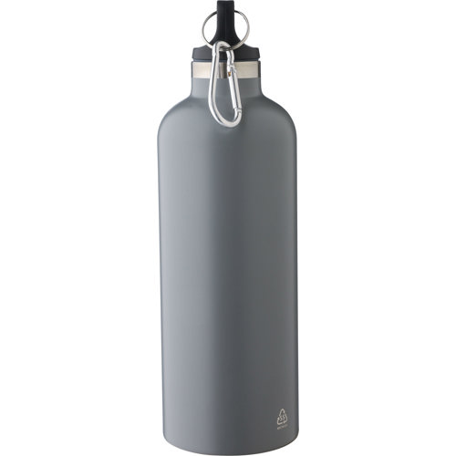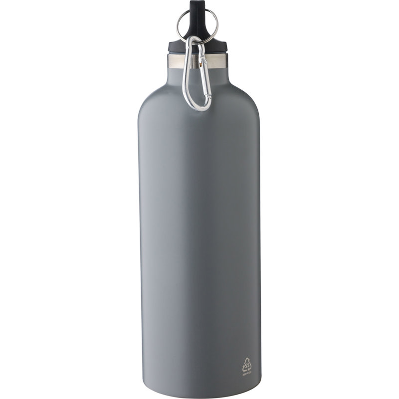 Recycled stainless steel double-walled bottle with a carabiner belt clip. Keeps beverages hot for 8 hours, and cold for 12 hours. The bottle features a matte finish (except for silver) and includes a recycled, lasered logo. Individually packaged in a cardboard box. Not dishwasher safe. . This item contains a recycled logo towards the bottom of the bottle on one side.