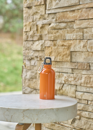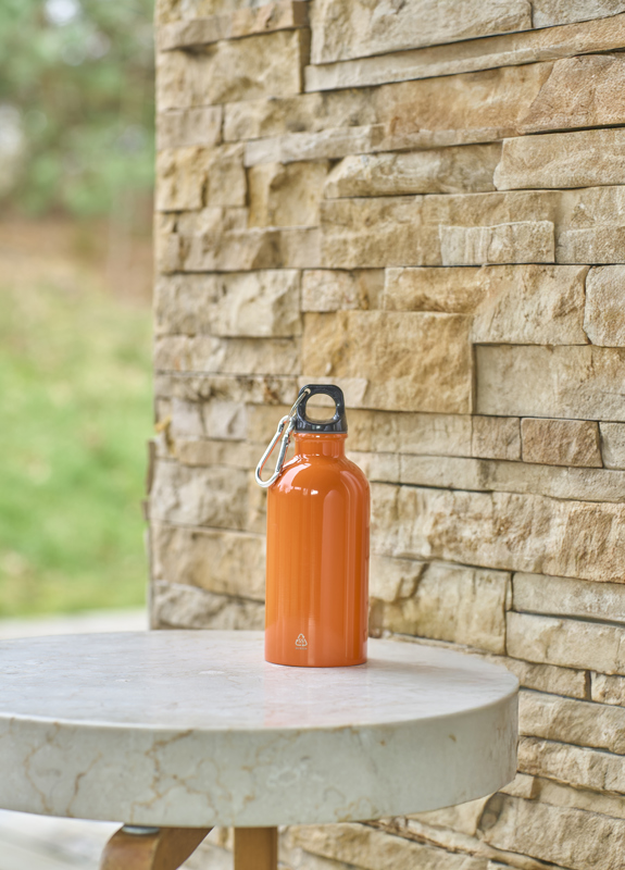 Recycled stainless steel single-walled bottle with a carabiner belt clip. Features a recycled engraved logo on the front. Not dishwasher safe.. This item contains a recycled logo towards the bottom of the bottle on one side.