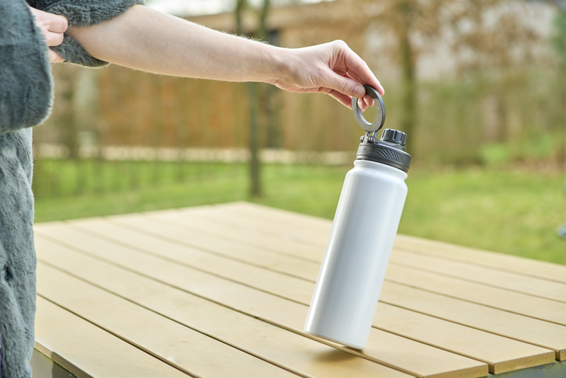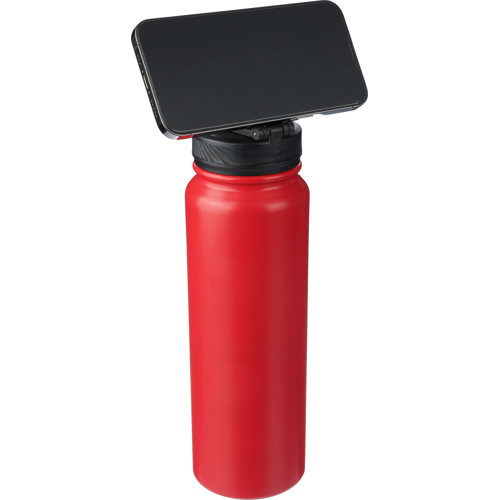 Double-walled bottle with a lid that has a carrying loop, and also doubles as a strong magnetic phone stand. Not dishwasher safe. Individually packaged in a brown cardboard box. Not dishwasher safe.