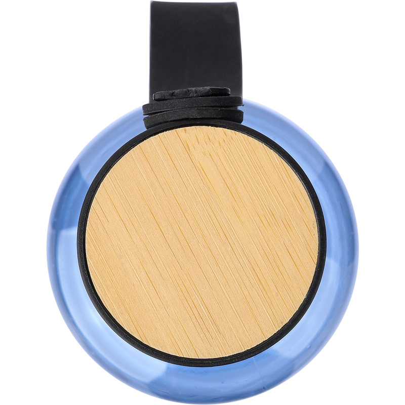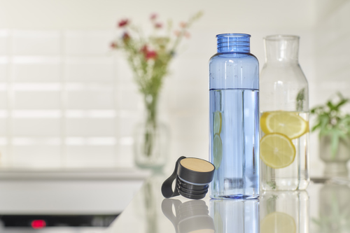 Single-walled drinking bottle with a bamboo inlay on the lid and silicone carrying strap. Not dishwasher safe.