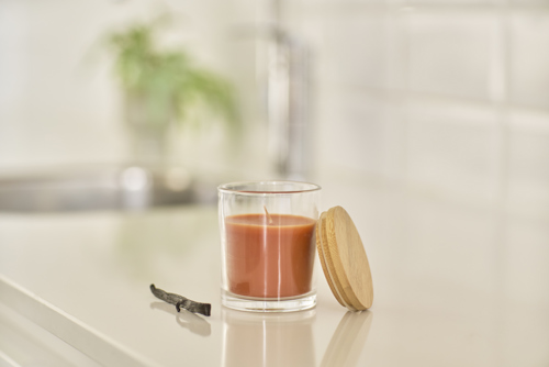 Glass candle with 120 grams of coloured vanilla scented wax. Provides approximately 20 hours of burning time. Individually packaged in a white carton tube.