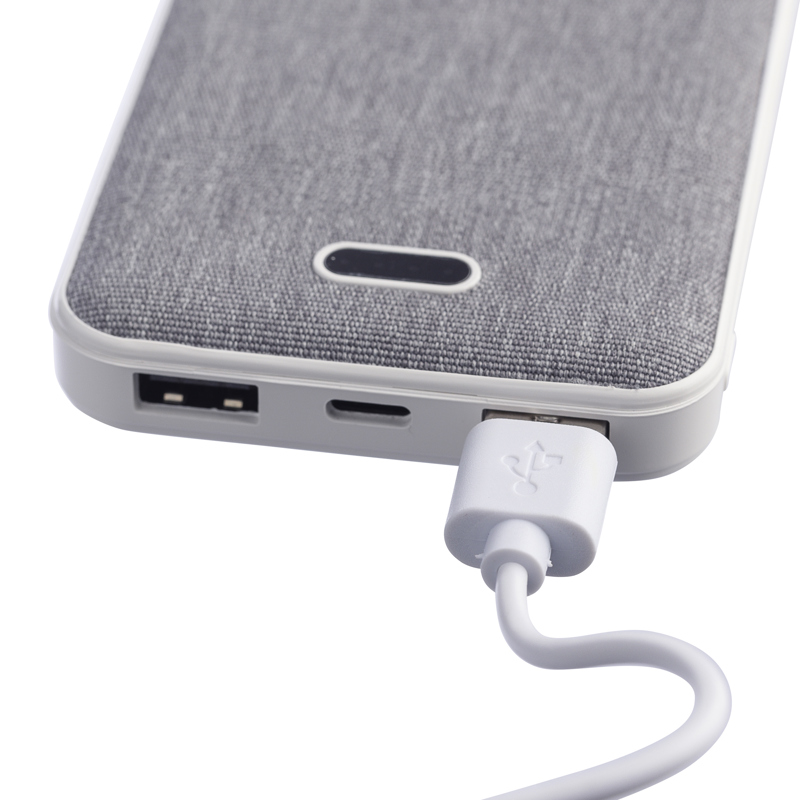 Recycled plastic and rPET power bank with 10,000 mAh capacity, dual USB and Type-C ports, charging display and rPET logo on top. Individually packaged in a brown cardboard box.