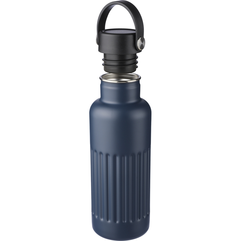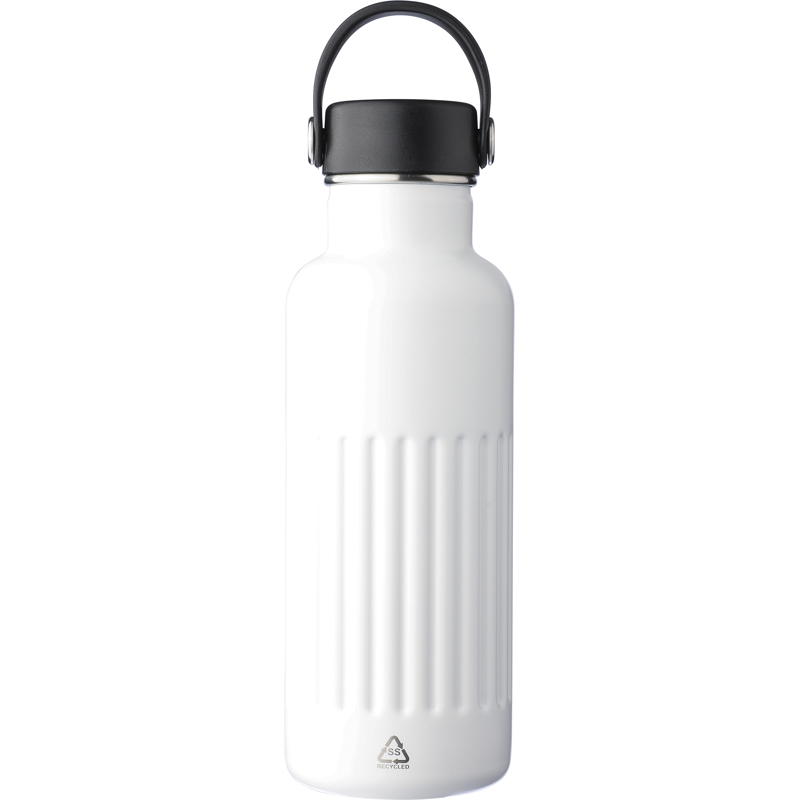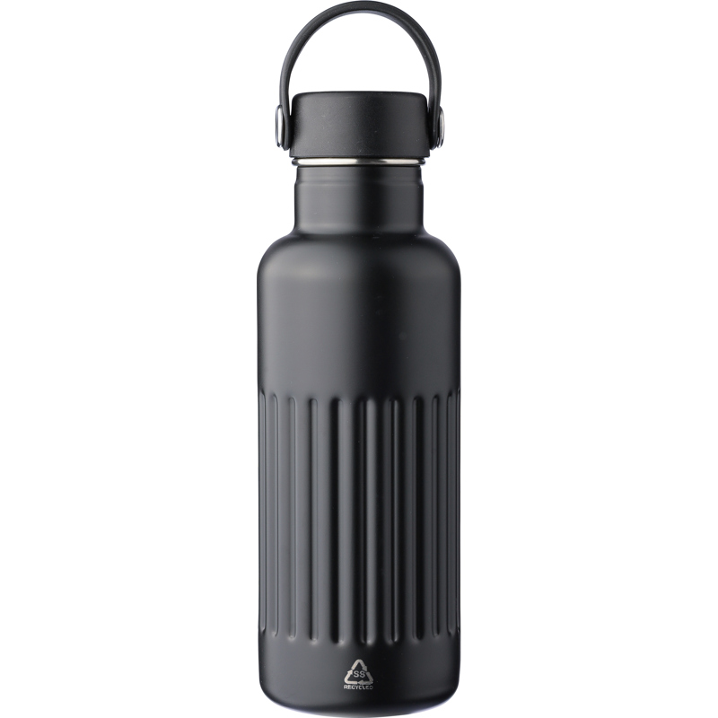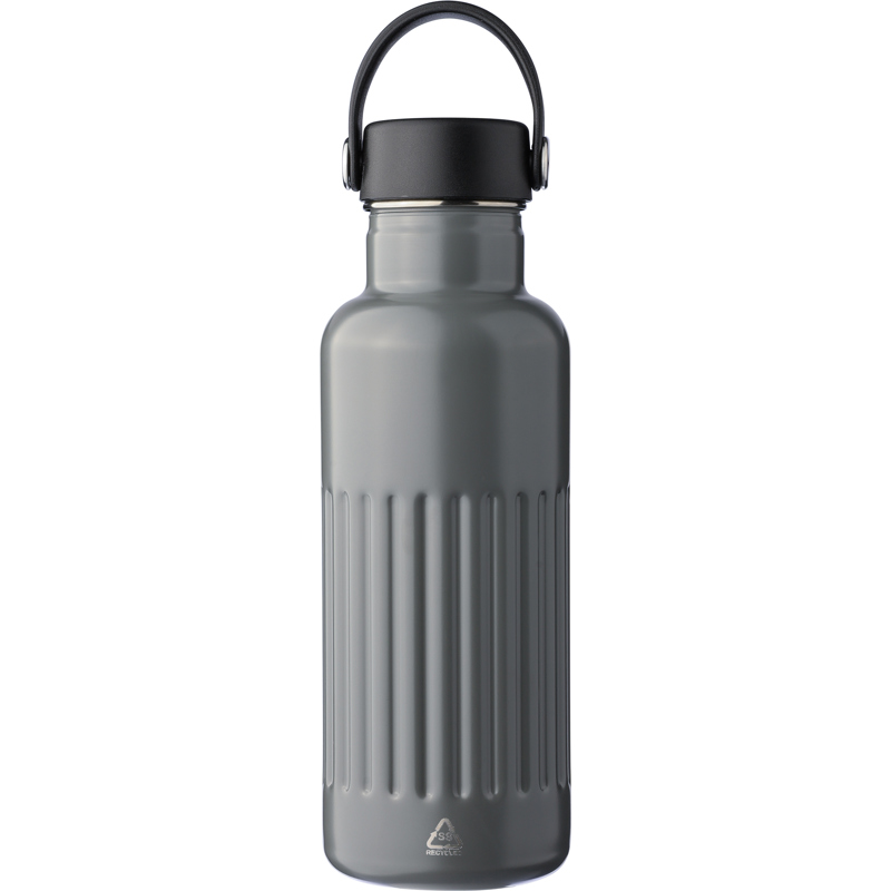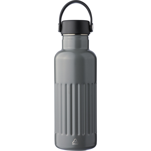 Recycled stainless steel drinking bottle with a TPE handle for easy carrying. Includes an engraved recycled logo on the body. Individually packaged in a brown cardboard box.