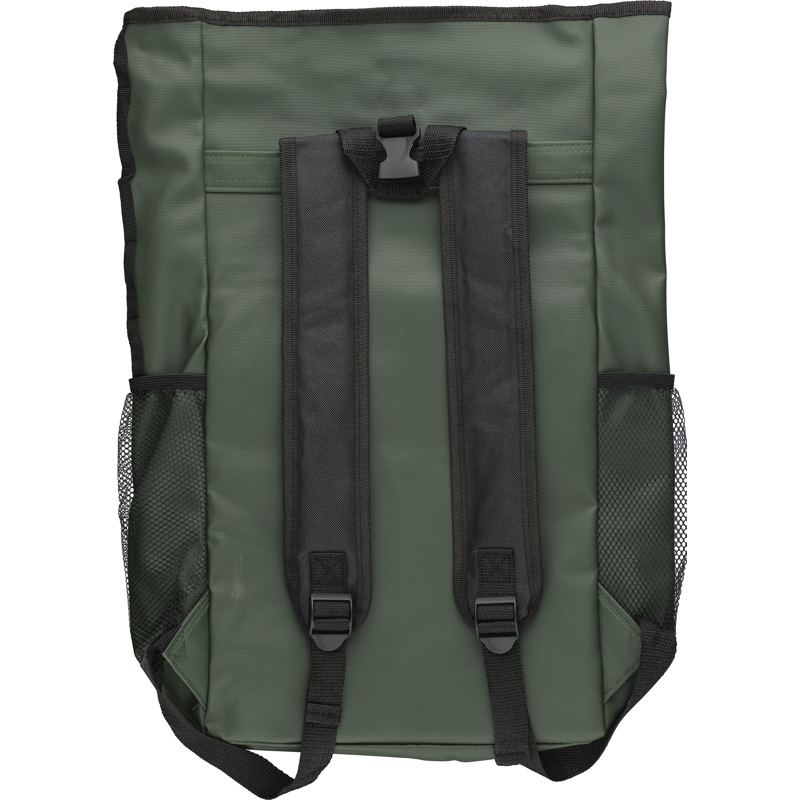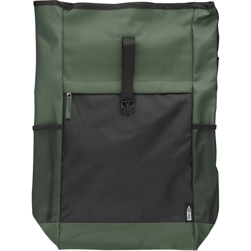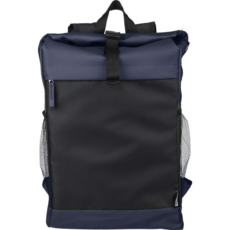 RPET (600D) polyester roll-top backpack with PU coating for water repellency. Features a front zipped pocket, padded laptop sleeve (fits laptops up to 15 inches), mesh side pockets, and a total of five compartments including inner and front pockets. Designed with adjustable carrying straps and an adhesive roll-top closure. Offers a 25-litre capacity and 15 kg carrying capacity. Includes an rPET label on the side.