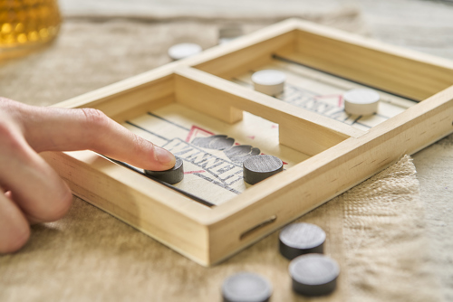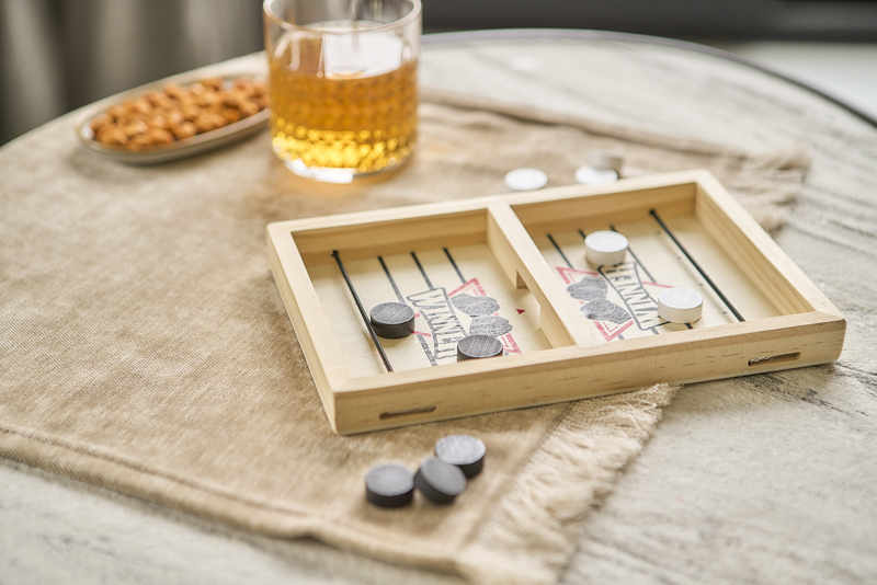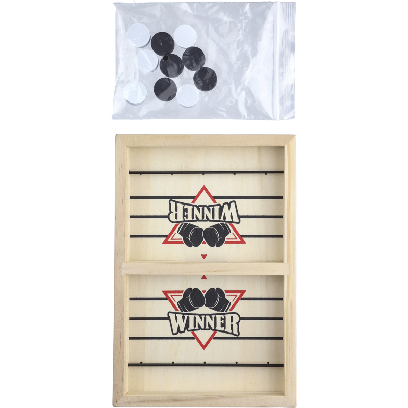 Wooden Fast Sling Puck game. Includes 10 chess chips and a manual for easy setup and play. A fast-paced skill game for adults Individually packaged in a brown cardboard box with an illustrated front.