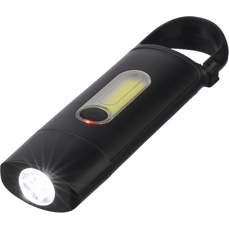 Recycled plastic mini flashlight with built-in 200mAh USB-rechargeable battery and carabiner. Features a front COB light and side COB floodlight with three light modes. Includes USB-C charging cable and recycled logo. Individually packaged in a brown cardboard box.