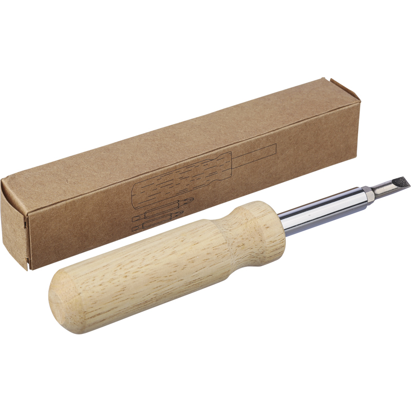 Rubberwood screwdriver set with four magnetic bits stored inside the handle. Practical and compact design with interchangeable bits and holder. Individually packaged in a brown cardboard box.