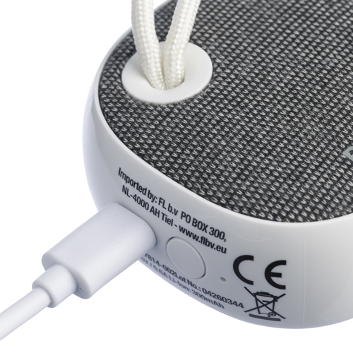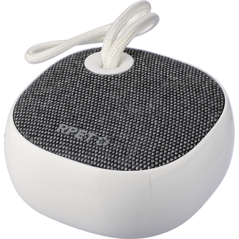 Recycled plastic and rPET fabric wireless speaker with small nylon carrying cord, 3W output and wireless technology version 5.3. with a 10-meter range. Includes 30 cm white USB-C charging cable. Features rPET logo on the fabric and Recycled ABS logo on the side. Individually packaged in a brown cardboard box.